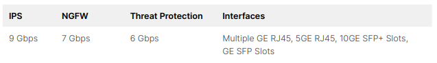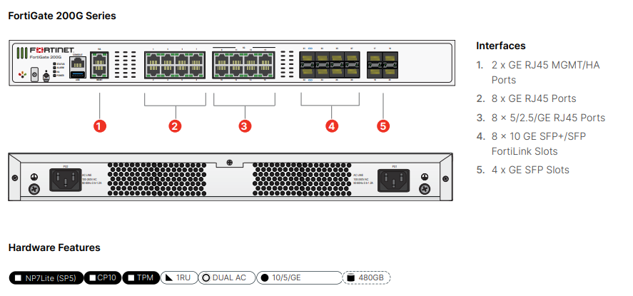 FortiGate-200G 10 x GE RJ45 (including 1 x MGMT port, 1 x HA port, 8 x switch ports), 4 x GE SFP slots, 8 x 5GE RJ45, 8 x 10GE SFP+ slots, NP7Lite and CP10 hardware accelerated.