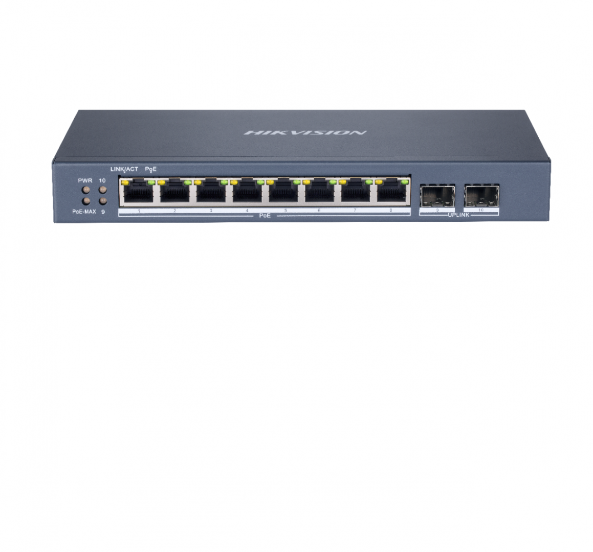 Switch 8 porturi Gigabit Hikvision DS-3E1510P-SI, L2, Smart Managed, 8 × Gigabit PoE ports si 2 × Gigabit fiber optical ports, 802.3af/at, PoE power budget 110W, transmisie pana la 300 m, PoE watchdog, VLAN, QoS, SNMP, Port Mirroring, Storm Control, Visualized Topology Management, Network Health Monitor, Real-Time Alarm Push si Video Control and Preview, carcasa metal, dimensiuni: 217.6 mm × 108.55 mm × 27.8 mm, greutate: 1.21 kg