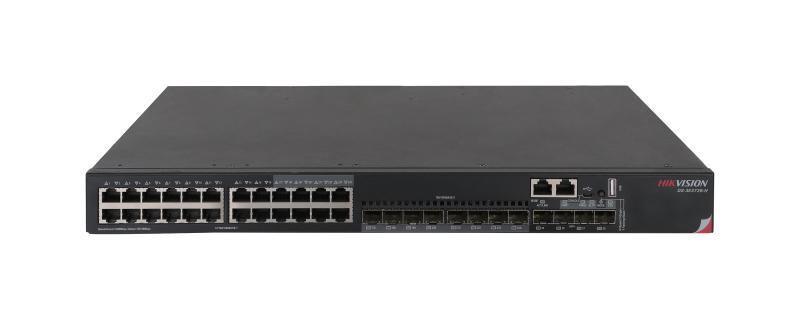 Switch Hikvision DS-3E3728-H: 24×10/100/1000BASE-T ports, 4×10G/1G BASE- X SFP+ ports, 1G/10G/40G port aggregation, VXLAN Layer 2 switching, VXLAN routing switching, VXLAN gateway, protocol: STP/RSTP/MSTP dimensiuni: 440×360×43.6mm, greutate: 6.7kg.