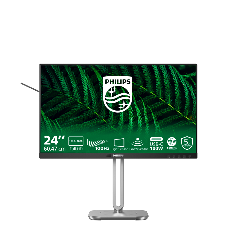 Monitor Philips 24″ 24B2G5301/00, Diagonal (inch): 24, Diagonal (cm): 60.96, Aspect ratio: 16:9, Panel: IPS, Resolution: 1920×1080, Refresh Rate: 60Hz, Response time GtG: 4ms, Brightness (max): 300 cd/m², Contrast (static) : 1500:1, Contrast (dynamic): 50M:1, Viewing angle: 178/178, Color Gamut Type: sRGB 110%, NTSC 96%*, Colours: 16.7M, Speakers: 3Wx2, VESA Wallmount: 100×100, Tilt: -5/+35, HAS: 150mm, Pivot: +/-90°, Swivel: -180/180, D-SUB: Yes, HDMI: x1, DisplayPort: x1, USB Hub: USB 3.2, Gen2, 10G, amonte: 1 USB-C1 (complet), USB-C2 (doar date), aval: 4 USB-A (cu 1 B.C 1.2 pentru încărcare rapidă), 1 USB-C3 (date, 15 W), USB-C: x3 USB C, USB-C Power Delivery: 15W, RJ-45: Yes, AUX: x1 3.5mm Audio OUT