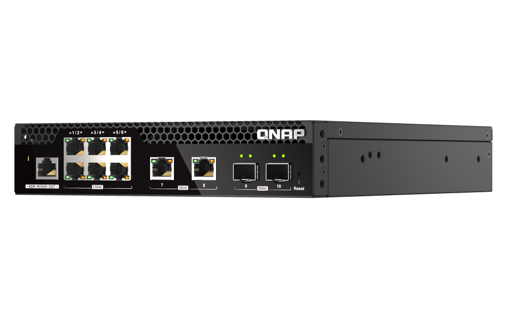 The QSW-M2106R-2S2T is a Layer 2 Web Managed Switch with two 10GbE SFP+ fiber ports, two 10GbE RJ45 ports and six 2.5GbE RJ45 ports. Supporting Layer 2 switching and network management via a user-friendly web user interface, the QSW-M2106R-2S2T offers flexible deployment in hybrid high-speed network environments and provides an entry-level network management solution. With a half-width design, two QSW-M2106R-2S2T can be installed in a 1U rack space for space-saving. The QSW-M2106R-2S2T is made in Taiwan (MIT), providing a high-quality and reliable networking solution.