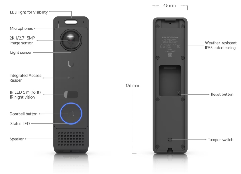 All-weather, PoE+ Doorbell with enhanced AI detections, two-way audio, a secondary package camera, and integrated Access Reader capabilities.