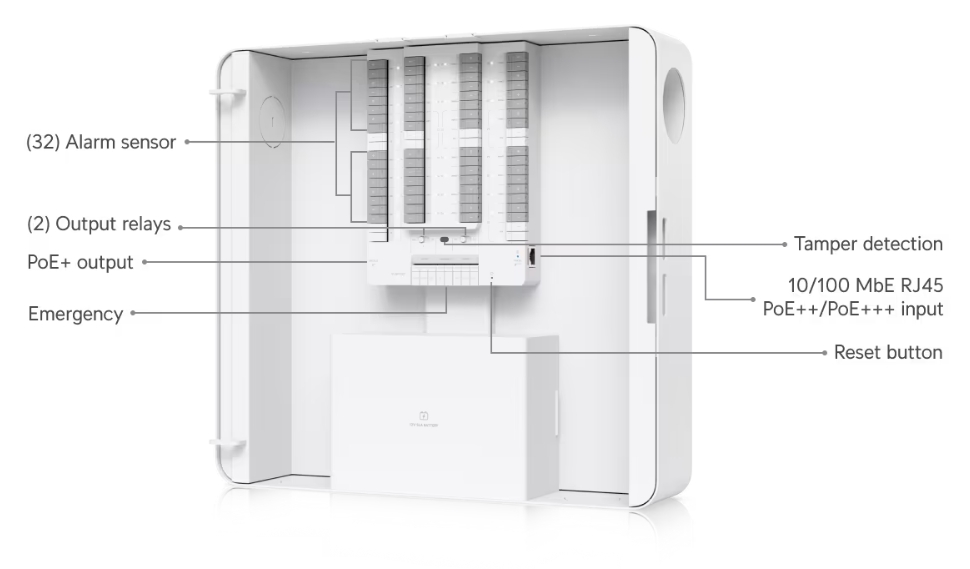 32 input zone alarm control hub for hardwire intrusion sensors powered using PoE++ input and optional battery backup.