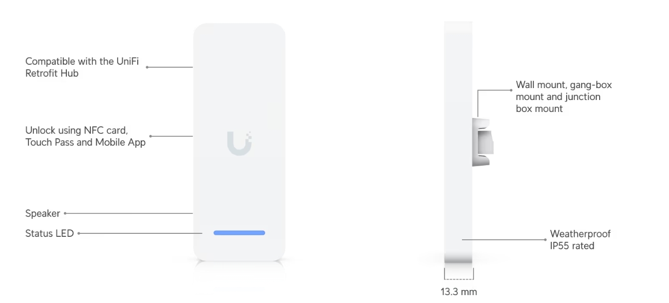 Indoor/outdoor OSDP reader with NFC Card and Touch Pass support, compatible with the UniFi Retrofit Hub using existing cabling.