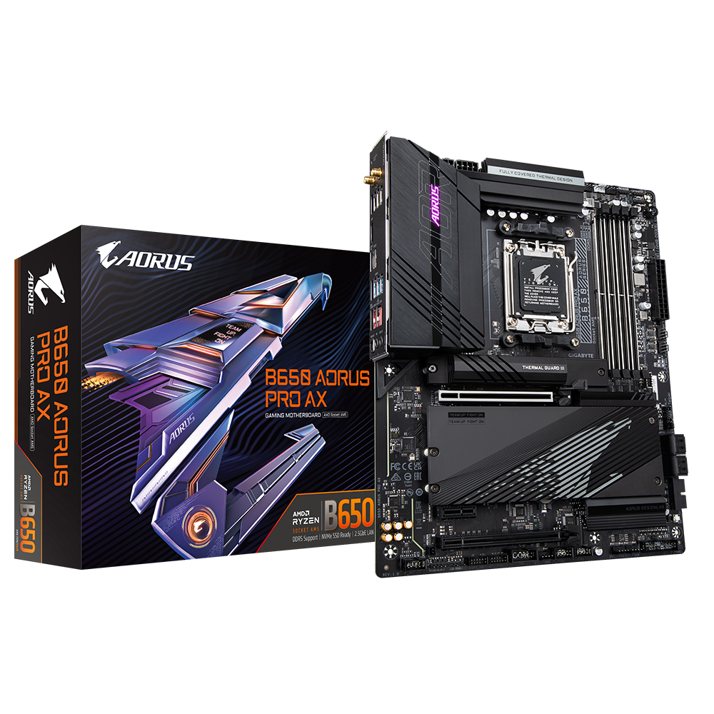 Placa de baza Gigabyte B650 AORUS PRO AX AM5, B650 Chipset, Supports 7000 series AMD Ryzen, 4x DIMM Slots, DDR5 6600MHz, PCIe Gen 4, 4x SATA 6Gb/s connectors, 3xM.2 Slot, 2.5GB LAN, USB Type-C, WIFI 6E, ATX
